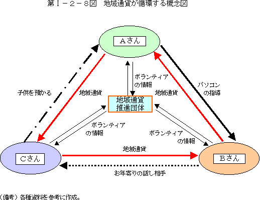 http://www.epa.go.jp/j-j/wp-pl/wp-pl00/hakusho-00-index.html より転載 (相互扶助を促進する時間預託制度や地域通貨) 第三に、気軽にボランティア活動をしたり、してもらうことができる仕組みについて考えてみよう。ここでは、我が国における時間預託制度と地域通貨の取り組みを紹介する。 時間預託制度は、ボランティア切符制度とも呼ばれることがある。この制度は、ボランティア活動をした人がボランティア活動を受けた人から、活動時間に応じてお金ではなくボランティア切符を受け取り、活動した時間を貯蓄するものである。将来、自分がボランティアのサービスを必要とする時に、その切符を使いサービスを受けることができる。時間預託制度は、一部の住民参加型在宅福祉サービス団体において、あるときは会員にボランティア活動をし、またあるときは会員からボランティア活動を受けるという、会員同士の相互扶助活動を促進する役割を果たしている。 地域通貨は、我が国では「エコマネー」と呼ばれることがある。これは、「円」では評価しにくいボランティアのサービスを、地域通貨を媒介としてやりとりすることで、ボランティアの輪を広げていくことを一つの目的としている。地域通貨が循環する一例を表すと、次の図のようになる(第I−2−8図)。 ![]() |