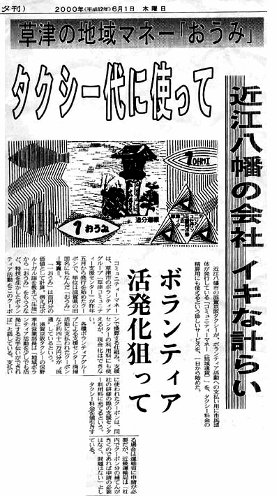 近江八幡市の滋賀京阪タクシーが、ボランティア活動への支払い用に草津の市民団体が発行している「コミュニティマネー(地域通貨)」を、タクシー料金の精算用にも使えるという珍しいサービスを、1日から始めた。